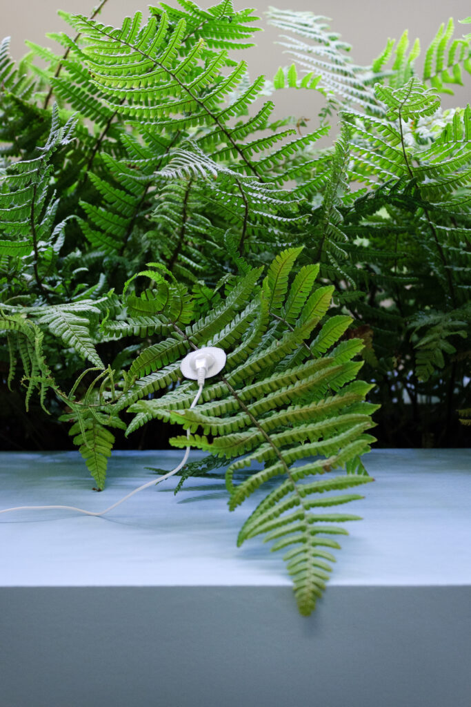 Fougères, électrodes, ordinateur, bois, lampe UV, casque audio, son génératif