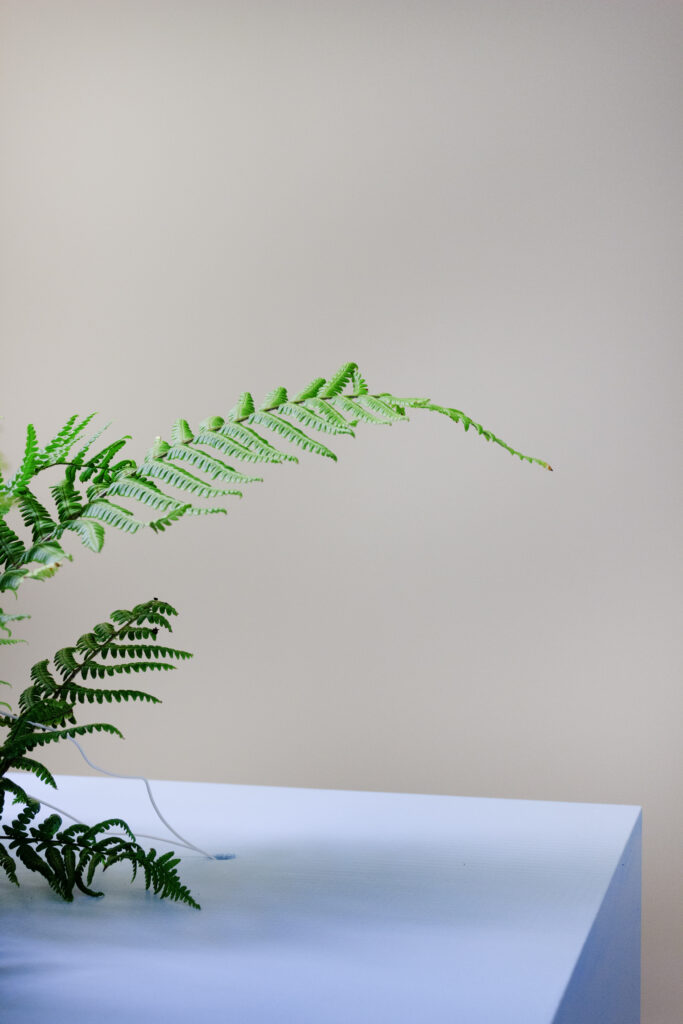 Ciel Solaire (Dryopteris wallichiana) (2025), l’installation de Clément Davout et Léo Fourdrinier, entend nous sensibiliser à une altérité radicale. Son dispositif capte les pulsations électriques d’une fougère provenant de la ville de Luxembourg et les traduit en langage musical. En dévoilant la sensibilité insoupçonnée cependant raffinée d’une plante, l’œuvre nous ouvre à l’extranéité du monde végétal.