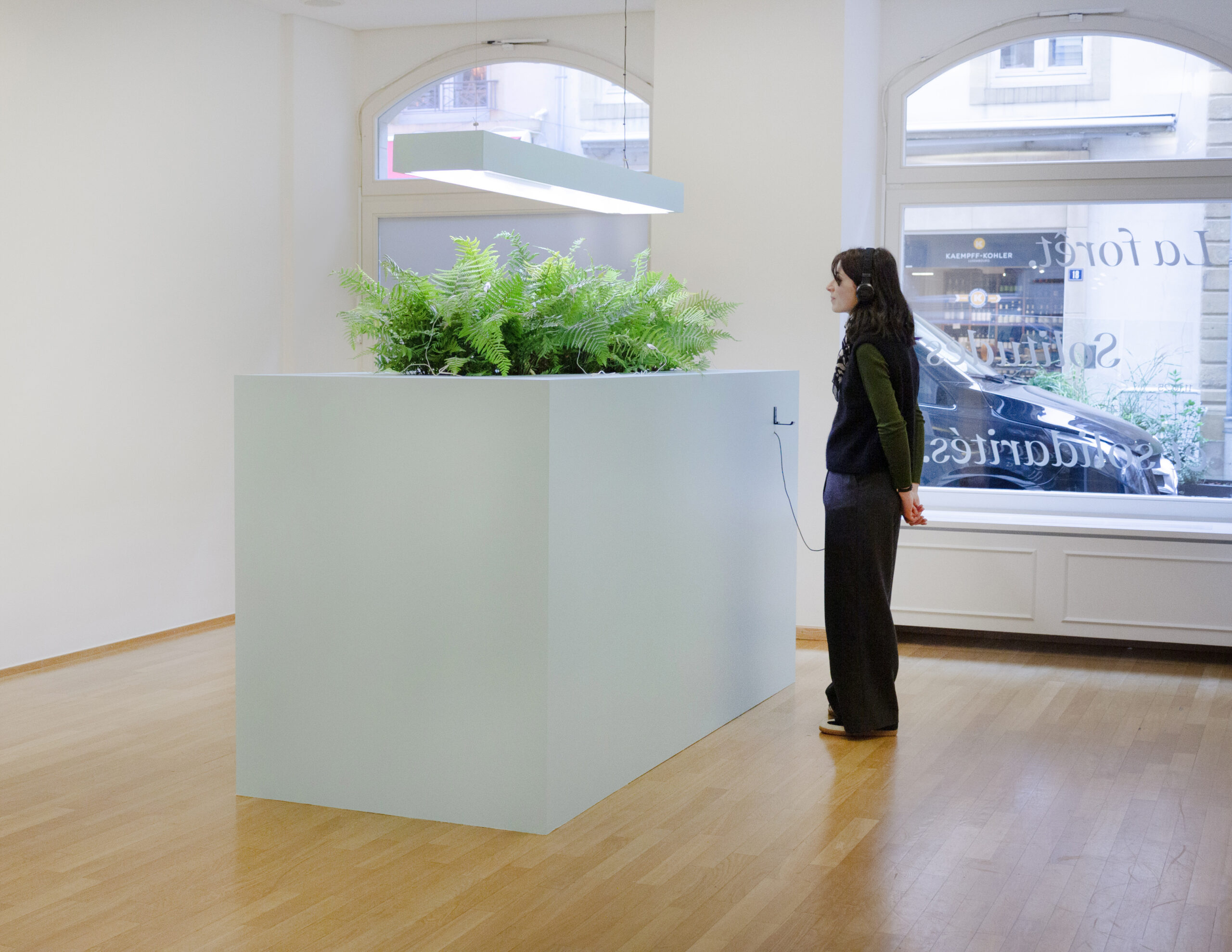Ciel Solaire (Dryopteris wallichiana) (2025), an installation by Clément Davout and Léo Fourdrinier, aims to raise our awareness of radical otherness. The installation captures the electrical impulses of a fern from the city of Luxembourg and translates them into musical language. By revealing the unsuspected yet refined sensitivity of a plant, the work opens us up to the strangeness of the plant world.