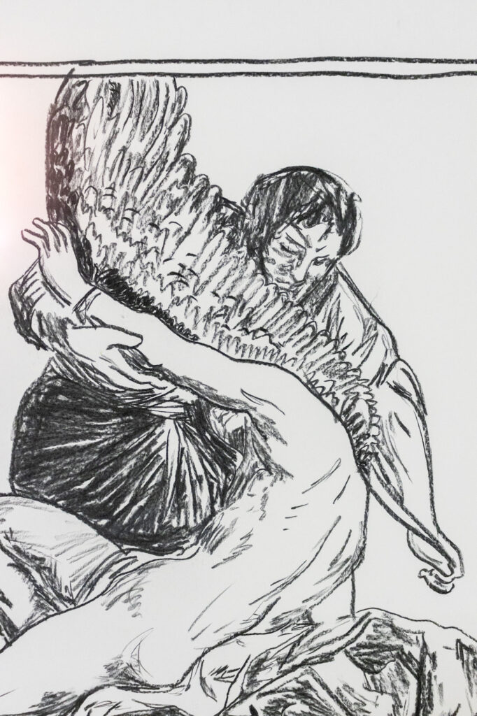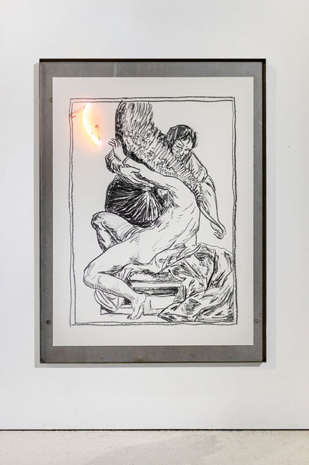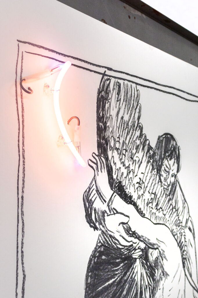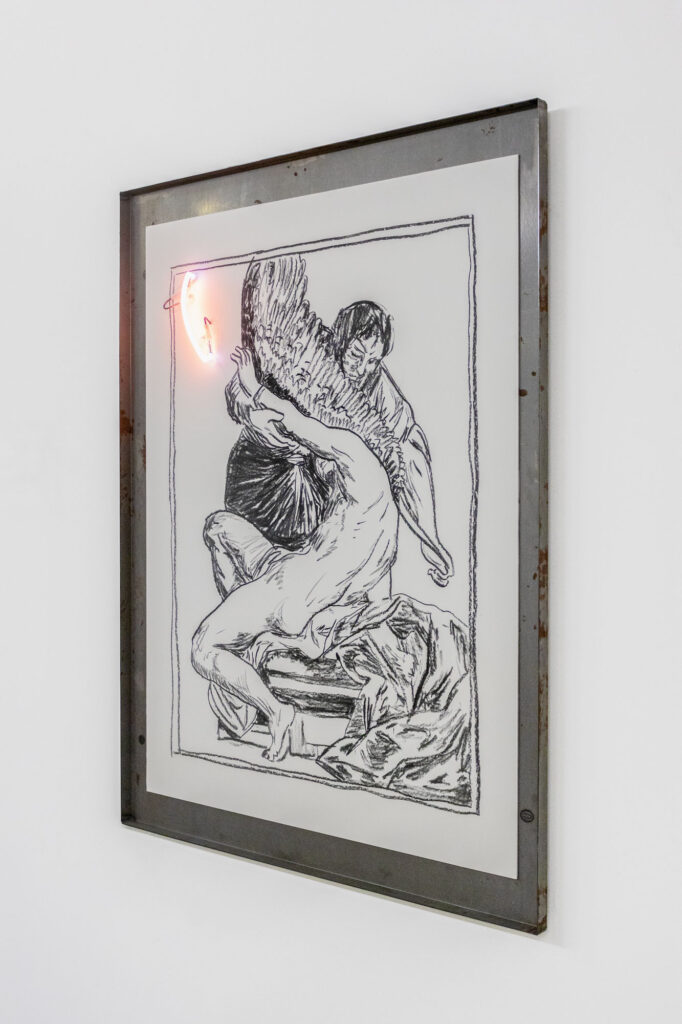< > Heatwave (Icarus)2025 Charcoal on paper, neon, raw steel150 x 120 cm59.1″ × 47.2″ Production Le Port Des Créateurs. Courtesy galerie Les filles du calvaire and the artist. © ADAGP, Paris, 2025 < >