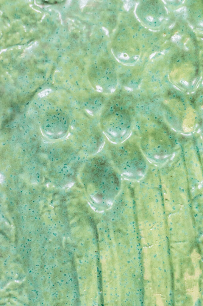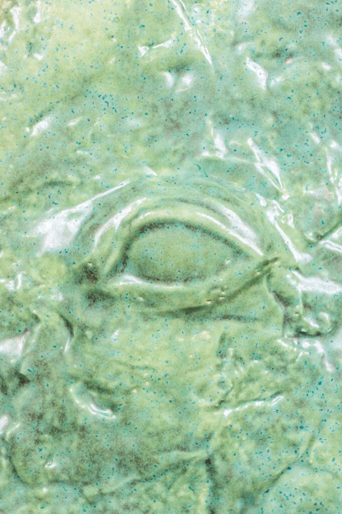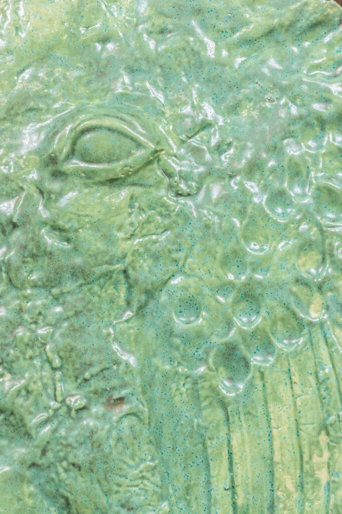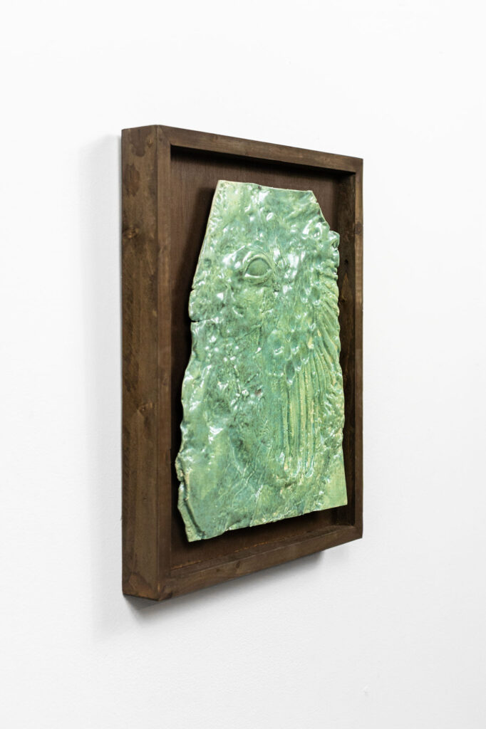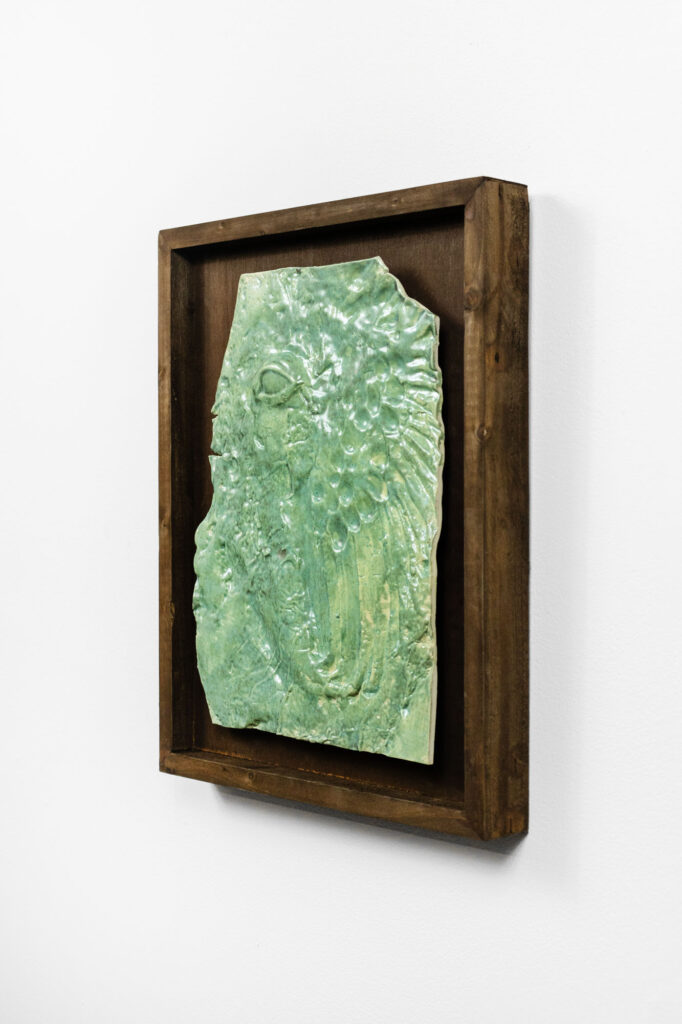 < > Into my eye a thousand joys lived, died, lived again (green fossile)2025Glazed earthenware, stained wood frame28 × 35 × 4 cm11.0″ × 13.8″ × 1.6″ Courtesy galerie Les filles du calvaire and the artist. © ADAGP, Paris, 2025 < >