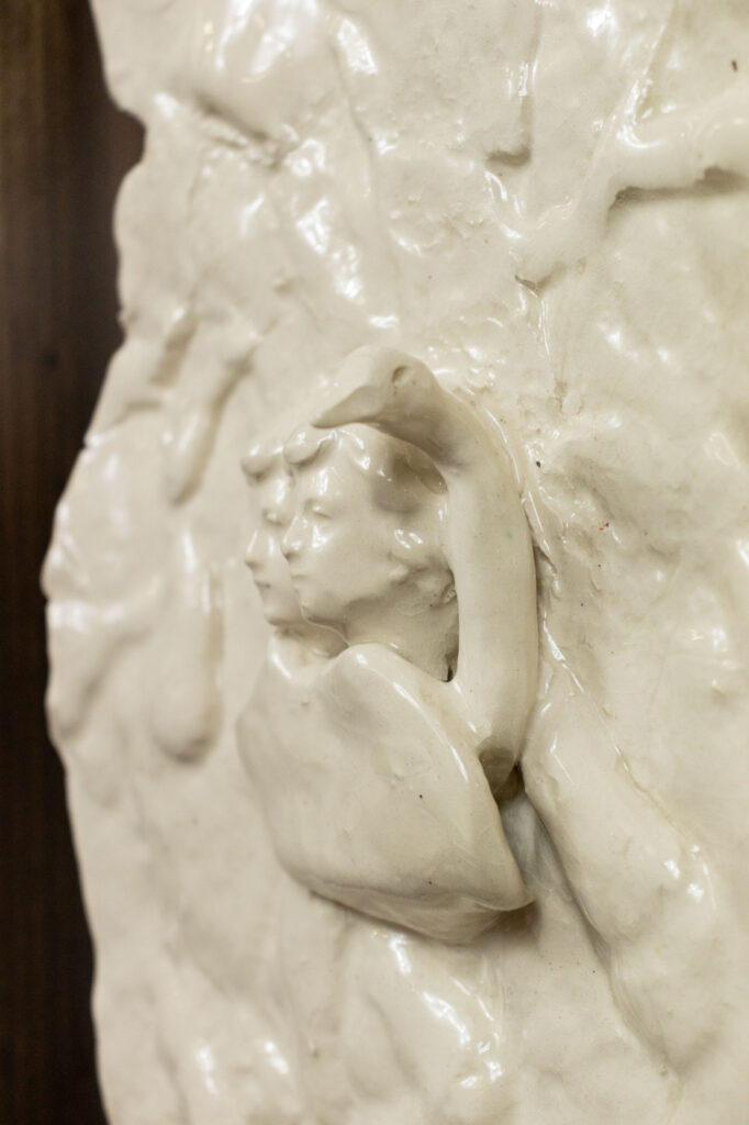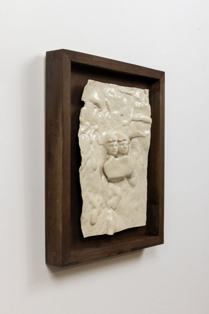 < > Love boat (Leda’s Tale revisited)2025Glazed earthenware, stained wood28,5 x 35,5 x 9 cm11.2″ × 14.0″ × 3.5″Private collection Courtesy galerie Les filles du calvaire and the artist. © ADAGP, Paris, 2025 < >