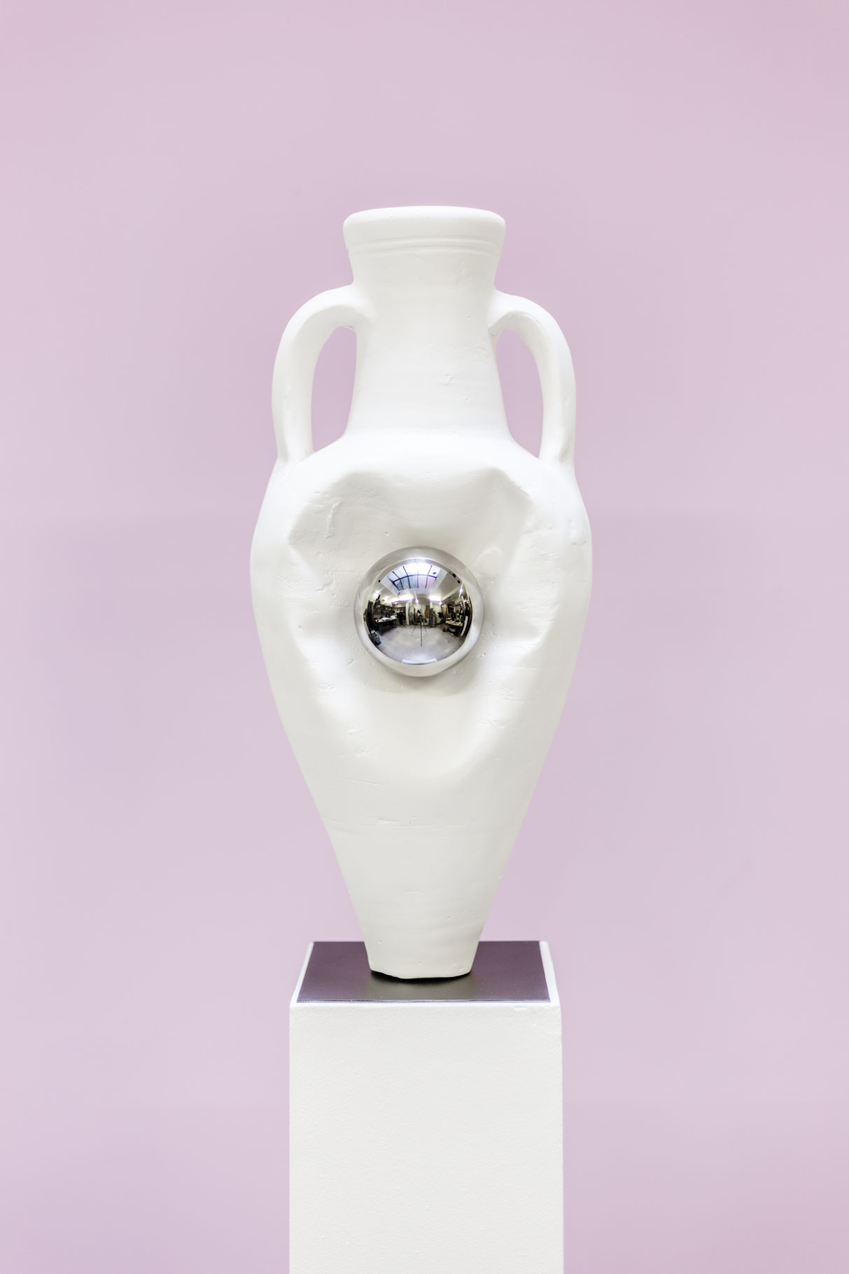The Lucid Dream works (2026) present a plaster cast of an ancient amphora compressed between two mirror-polished stainless steel spheres. The deformation results from a precise fabrication protocol: during casting, the pressure of the spheres constrains the silicone mold and imprints its form into the still-soft material. This compression brings opposing qualities into tension—soft and hard, surface and impact—while evoking a phenomenon close to a digital glitch. More explicitly political, the work stages a relationship of force: the amphora, an archaeological form associated with preservation and transmission, is caught between two pressures that question the production of knowledge—how a truth is constructed, hierarchized, and imposed. In this crushing of forms, a nearly organic dimension also emerges, as the material appears to yield under constraint, introducing an ambiguous tension between domination and surrender.