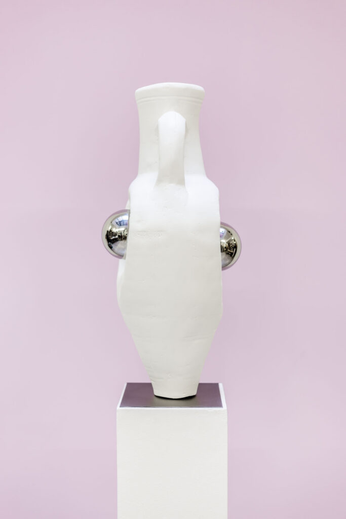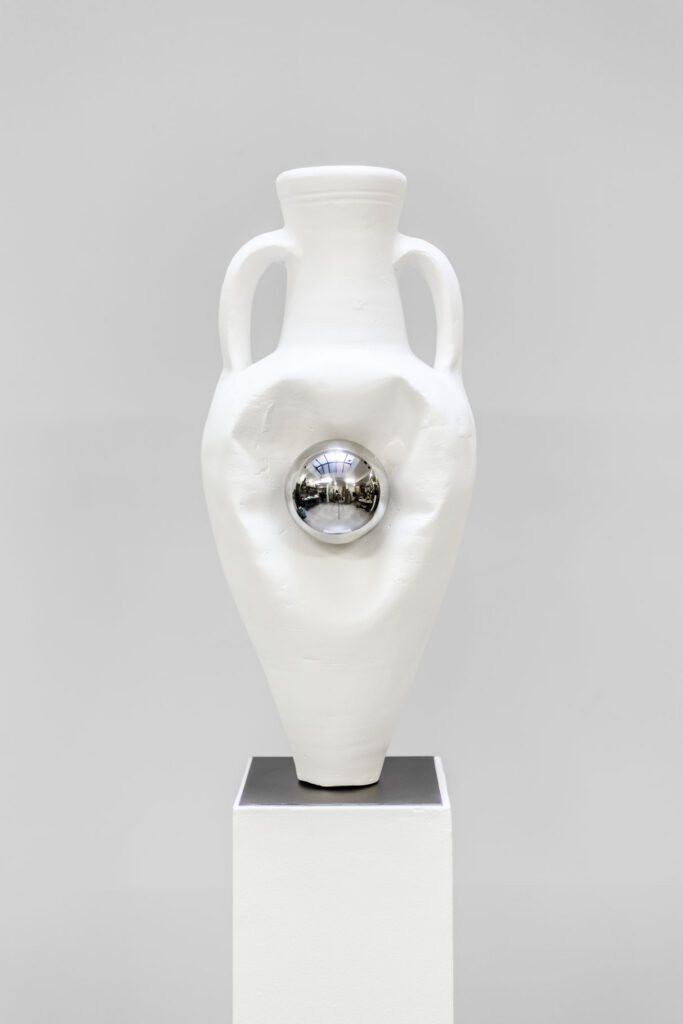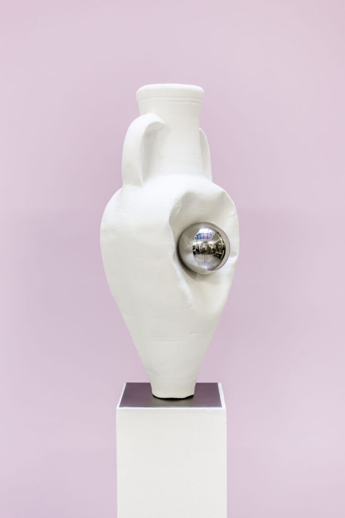 Les œuvres Lucid Dream (2026) présentent une amphore antique moulée en plâtre, comprimée entre deux sphères en inox poli miroir. La déformation résulte d’un protocole de fabrication précis : lors de la coulée, la pression des sphères contraint le moule en silicone et imprime sa forme dans la matière encore souple. Cette compression met en tension des qualités opposées — mou et dur, surface et impact — tout en évoquant un phénomène proche du glitch numérique. Plus explicitement politique, la pièce met en scène un rapport de force : l’amphore, forme archéologique associée à la conservation et à la transmission, se trouve prise entre deux pressions qui interrogent la fabrique du savoir — comment une vérité se construit, se hiérarchise et s’impose. Dans cet écrasement apparaît aussi une dimension presque organique, où la matière semble céder sous la contrainte, introduisant une tension ambiguë entre domination et abandon.