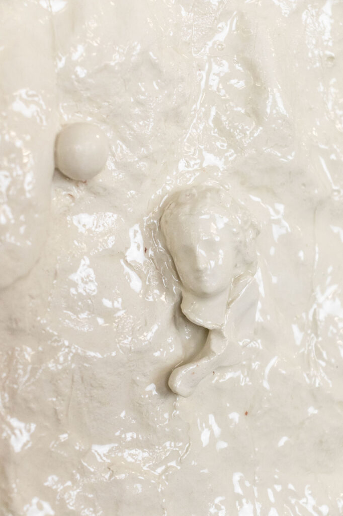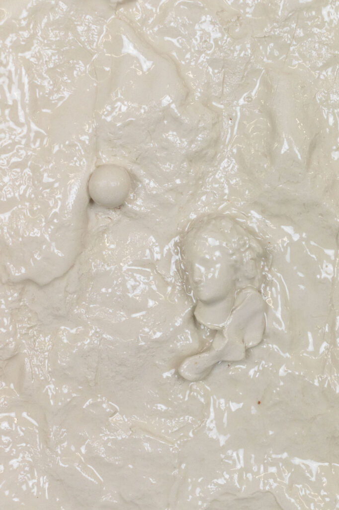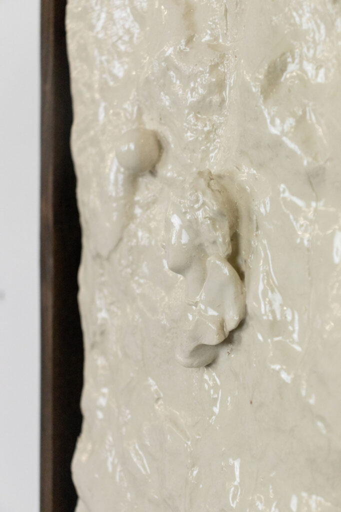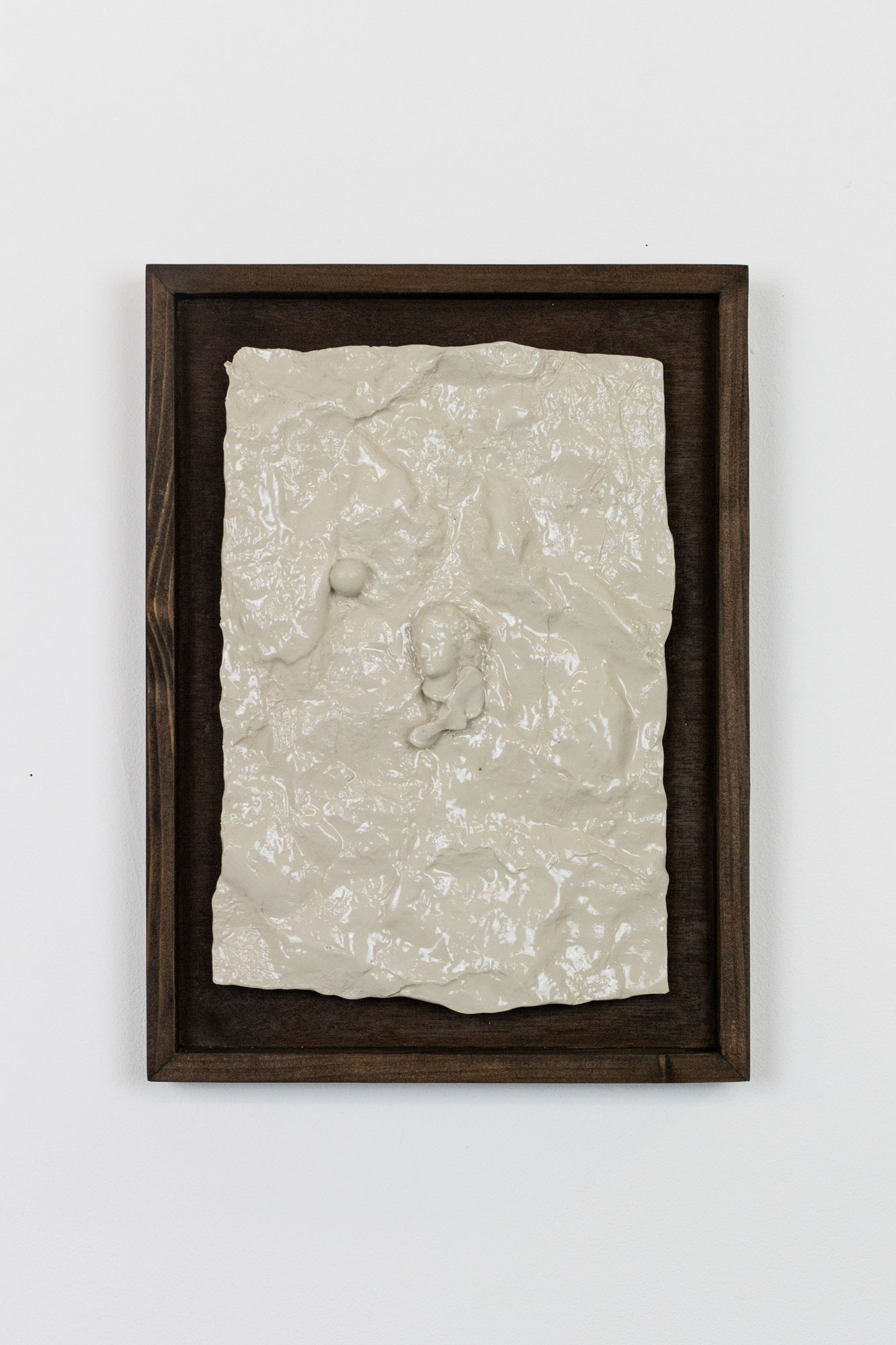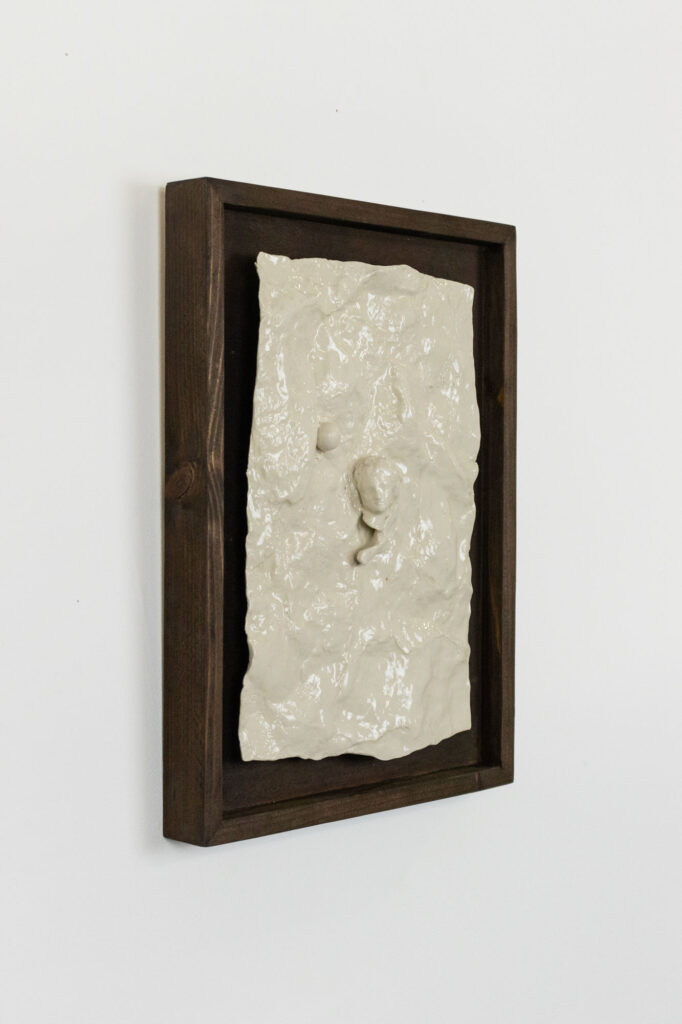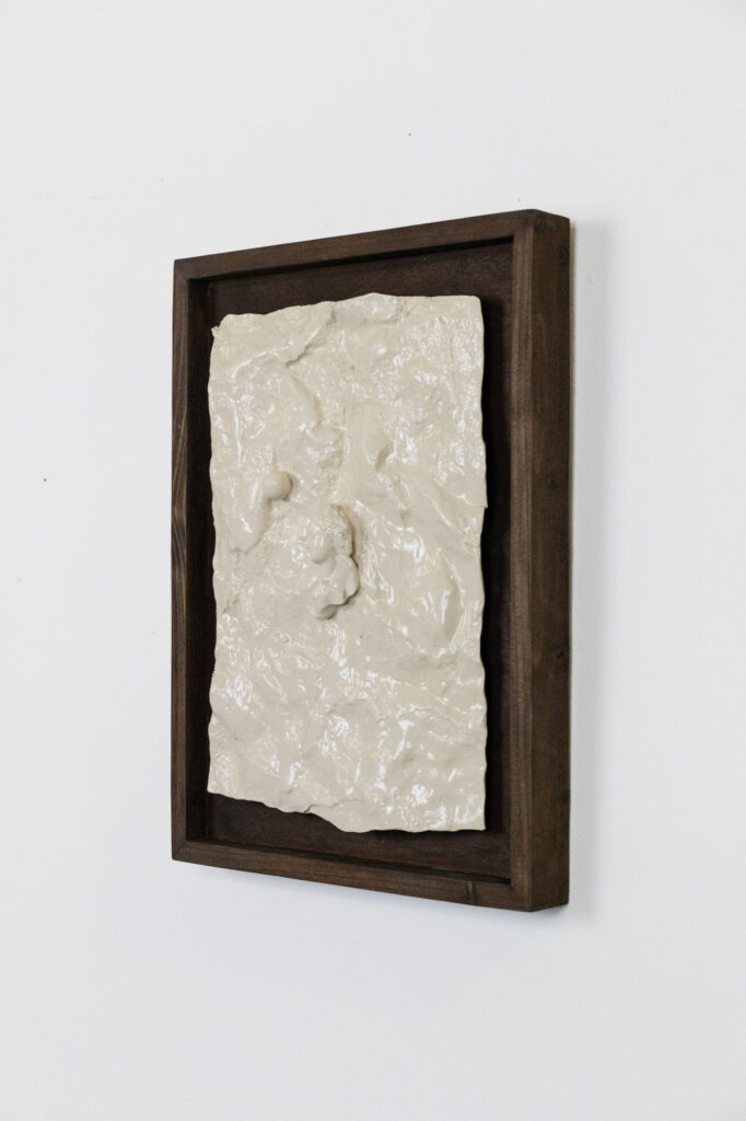 < > moment of emotional release (revolution)2025Glazed earthenware, stained wood frame28,5 x 38,5 x 5,5 cm11.2″ × 15.2″ × 2.2″ Courtesy galerie Les filles du calvaire and the artist. © ADAGP, Paris, 2025 < >